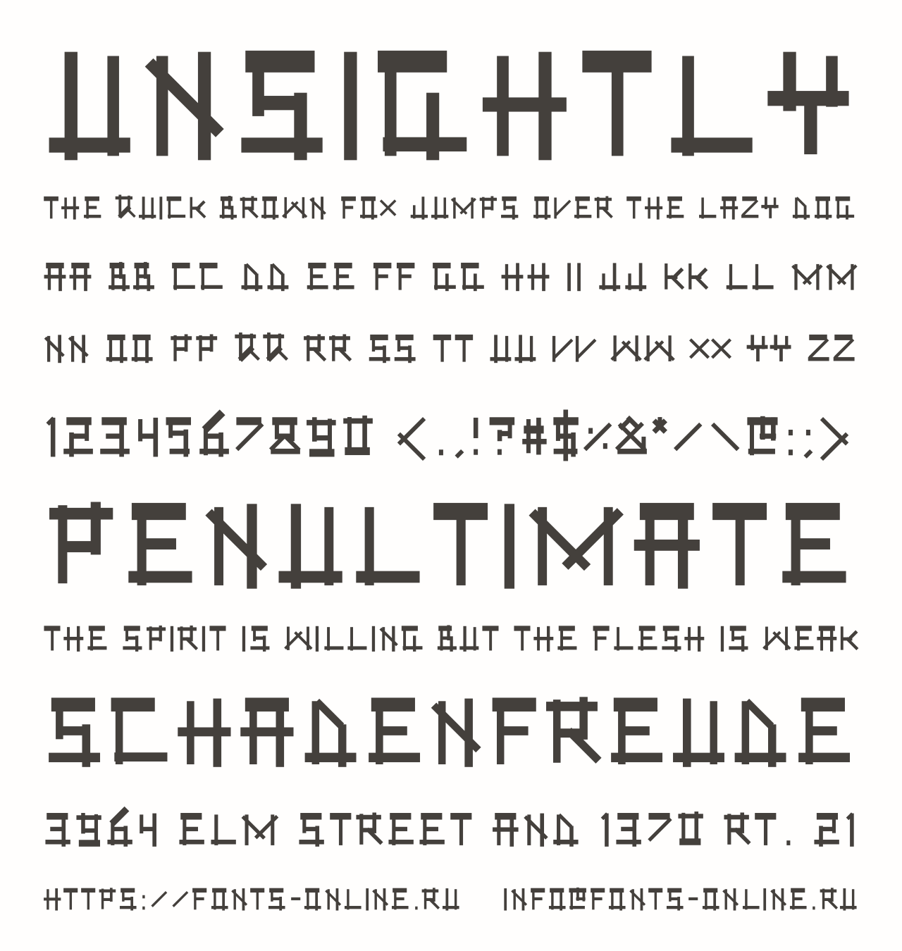 Шрифт Unsightly. Гарнитура содержит 1 файл и поддерживает 53 языка. Лицензия CC0 1.0. Можно использовать в коммерческой и не коммерческой деятельности. Разработка Unsightly велась GGBotNet.