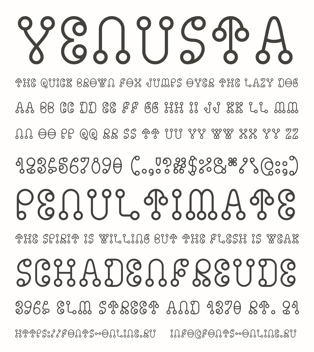 Шрифт Venusta. Гарнитура содержит 1 файл и поддерживает 12 языков. Лицензия SIL OFL 1.1. Можно использовать в коммерческой и не коммерческой деятельности. Разработка Venusta велась GGBotNet.