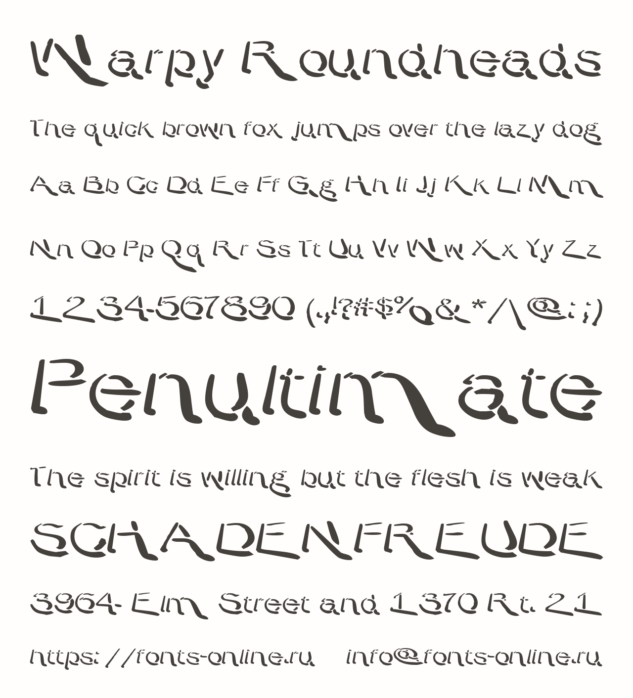 Шрифт Warpy Roundheads. Гарнитура содержит 1 файл и поддерживает 12 языков. Можно использовать в коммерческой и не коммерческой деятельности.