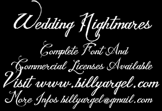 Шрифт Wedding Nightmares Personal Use. Гарнитура содержит 1 файл и поддерживает 12 языков. Можно использовать в не коммерческой деятельности. Разработка Wedding Nightmares Personal Use велась Billy Argel.