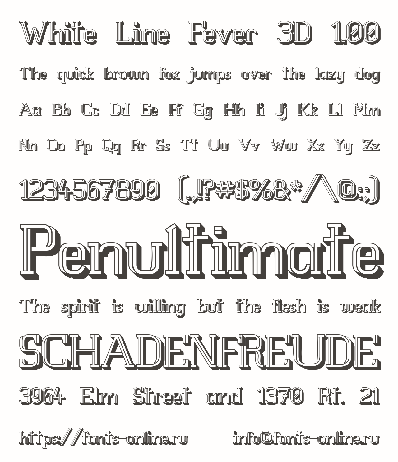 Шрифт White Line Fever 3D 1.00. Гарнитура содержит 5 файлов и поддерживает 39 языков. Можно использовать в коммерческой и не коммерческой деятельности.