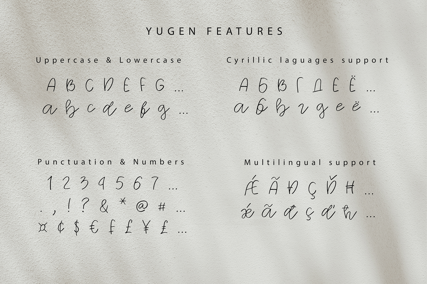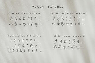 Шрифт Yugen. Гарнитура содержит 1 файл и поддерживает 41 язык. Разработка Yugen велась Mr. Typeman.