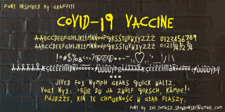 Шрифт zai COVID-19 VaCcine. Гарнитура содержит 1 файл и поддерживает 54 языка. Можно использовать в не коммерческой деятельности. Разработка zai COVID-19 VaCcine велась Tomasz Skowroński.