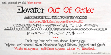 Шрифт zai Elevator Out Of Order. Гарнитура содержит 1 файл и поддерживает 54 языка. Можно использовать в не коммерческой деятельности. Разработка zai Elevator Out Of Order велась Tomasz Skowroński.