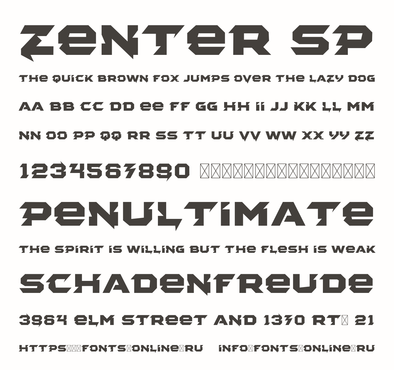 Zenter SP — это тяжёлый, геометрический шрифт с острыми срезами и молниевидными штрихами. Его массивные формы создают ощущение силы и энергии, а ломаная пластика придаёт динамику и технологичность. Шрифт хорошо подходит для логотипов, плакатов, спортивной айдентики, а также любых акцидентных задач, где требуется подчеркнуть мощь и стремительность.